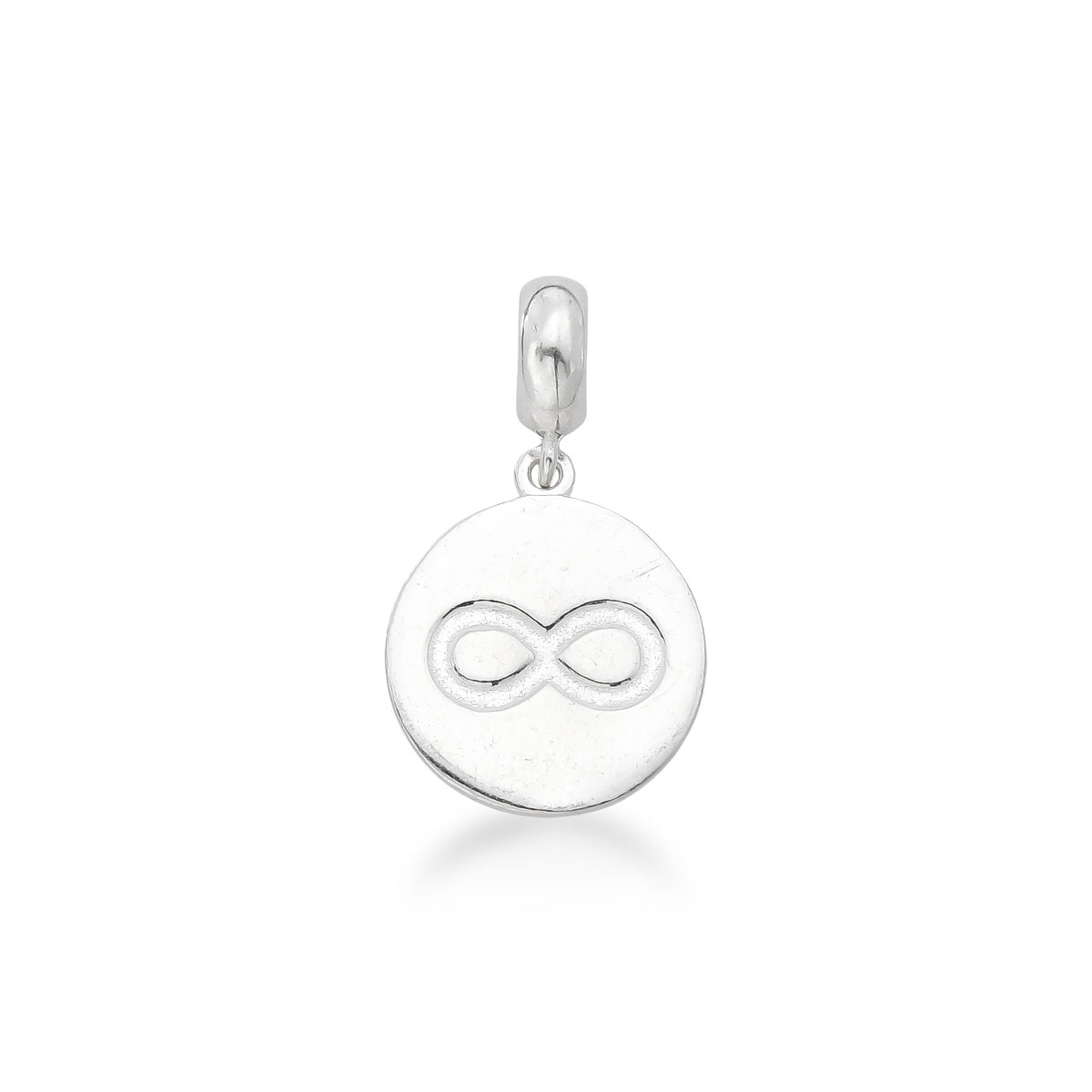 O Berloque Infinito é confeccionado em Prata 925 e possui um design redondo com uma frase no verso ) viva bem, sorria mais, ame sempre).