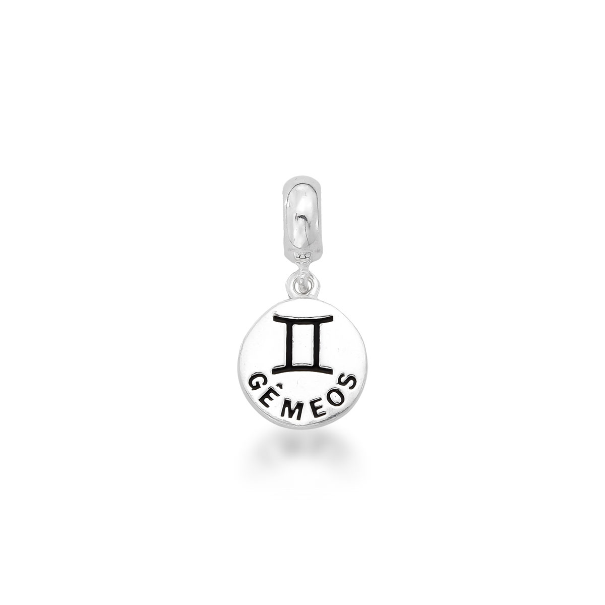 O Berloque signo gêmeos é confeccionado em Prata 925 e possui um design redondo com escrita ambos lados iguais.