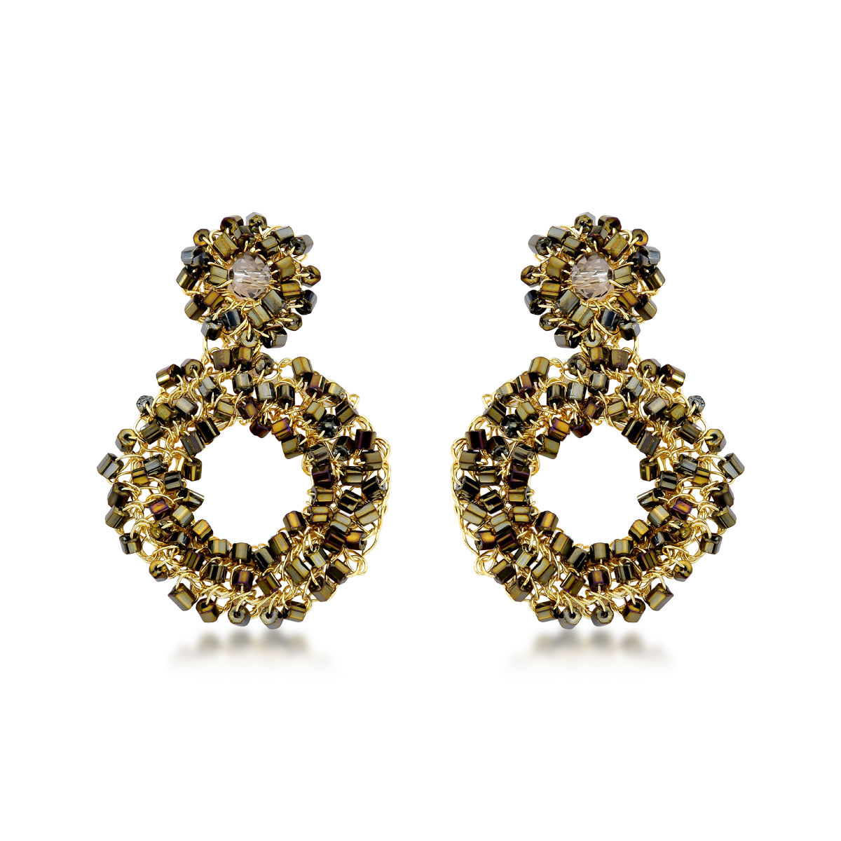 O brinco é composto por cristais importados, onde cada cristal é selecionado e posicionado manualmente. Feito com a técnica de crochê em fio de cobre banhado a ouro 18K e utilizando tecnologia hipoalergênica, todo o brinco é artesanalmente confeccionado por artesãos altamente qualificados, garantindo qualidade e acabamento excepcionais. Além de lindíssimo, é um acessório super leve e confortável, perfeito para qualquer ocasião.