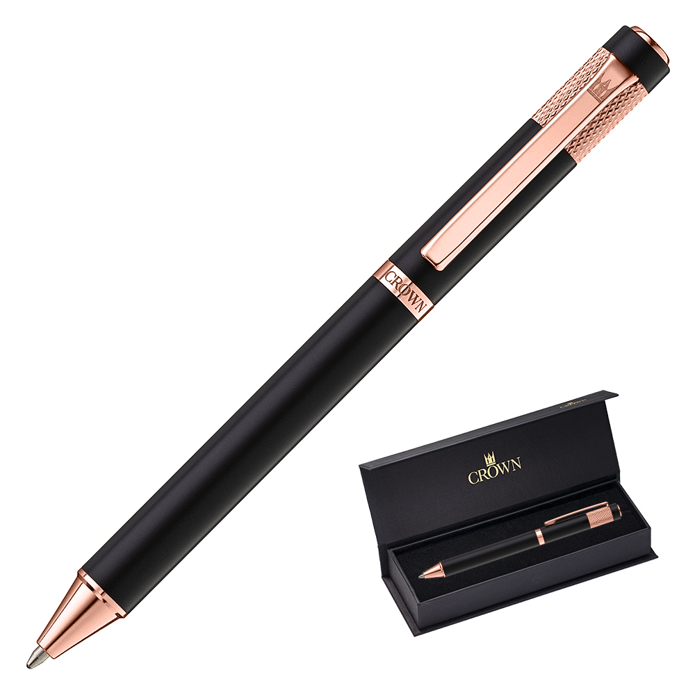 - DESCRIÇÃO: Caneta Crown Personalizada Rubi Esferográfica, preta com detalhes rose. Abertura com sistema de torção.