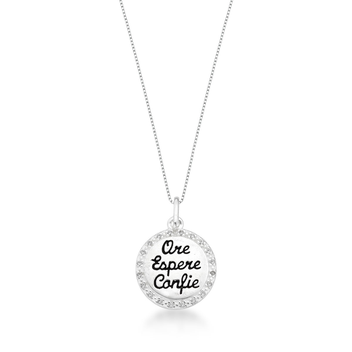 Colar Medalha Cravejada Ore Espere Confie Prata 925