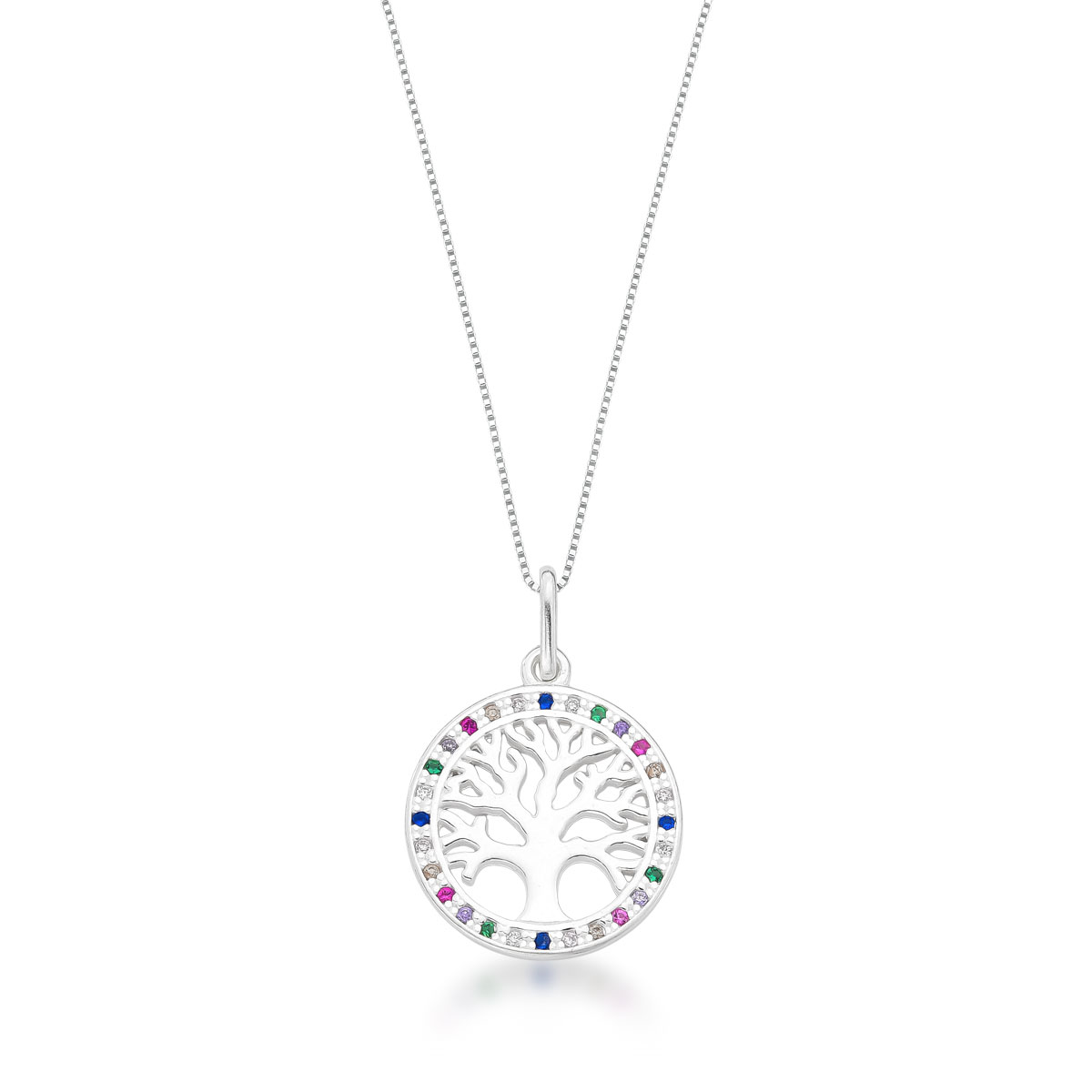 Perfeição de colar com uma medalha de árvore cravejada com micro zircônias coloridas. Uma joia que deixa qualquer look elegante.