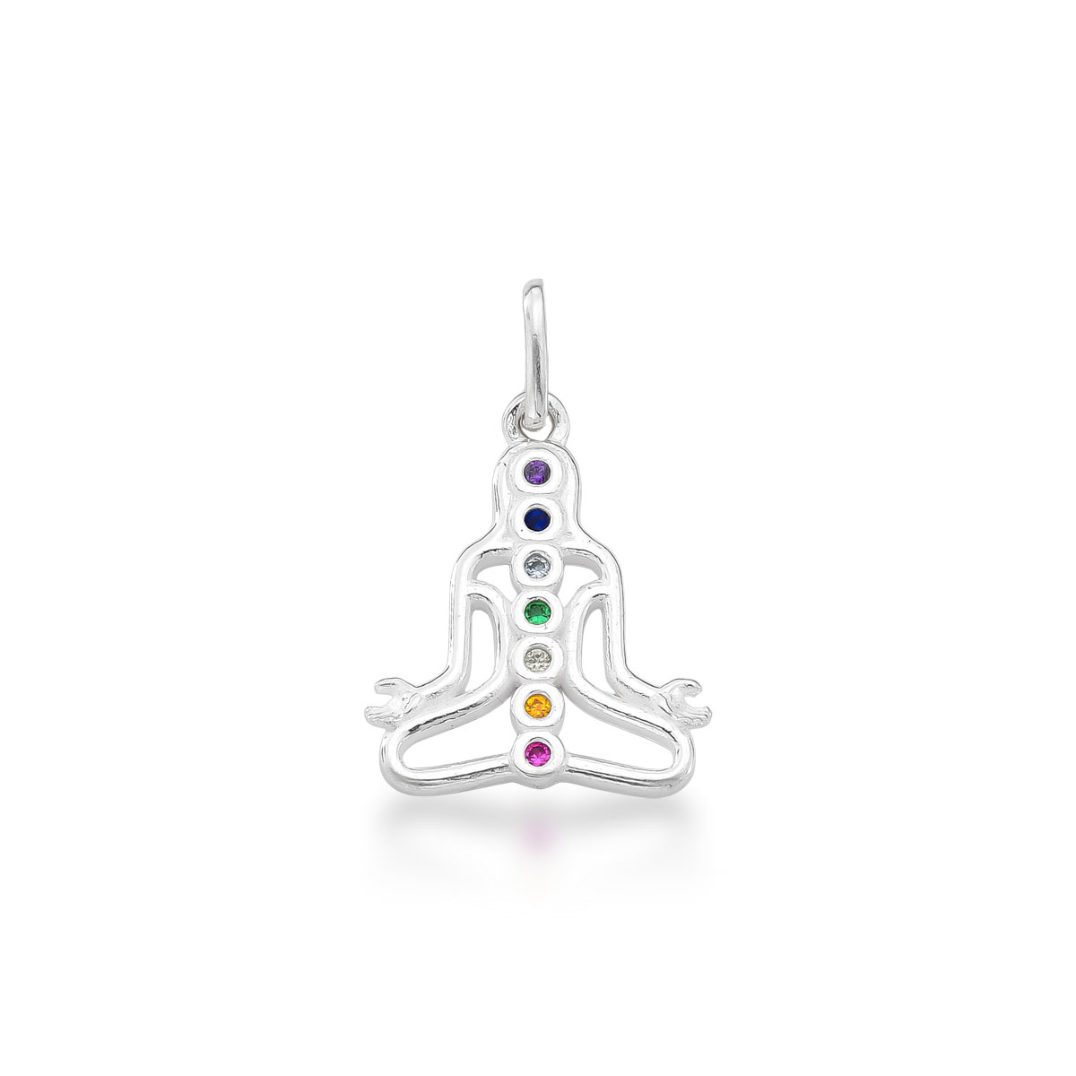 O Pingente meditação é confeccionado em Prata 925 e possui um design super delicado com zircônias coloridas em que cada cor está associada a diferentes funções de nossos corpos.