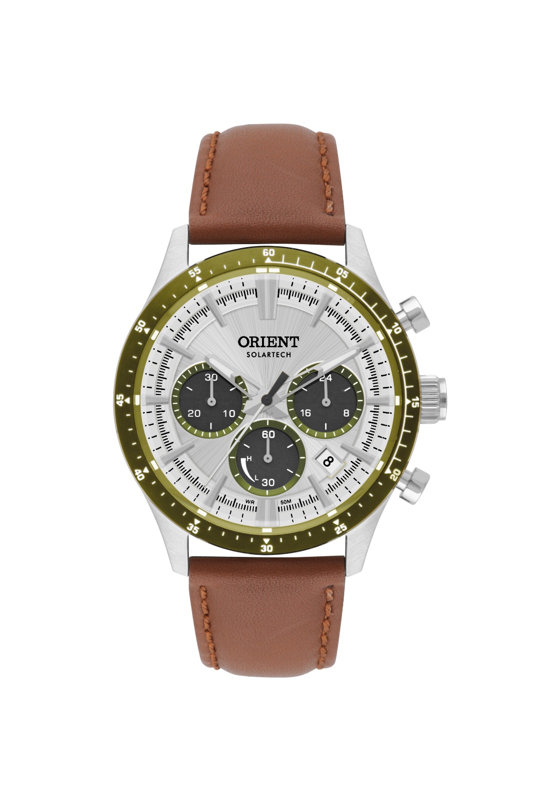relogio orient masculino, relogio orient cronografo, orient solartech, relogio movido a energia solar, MBSCC065 S1MX, relogio masculino couro marrom, relogio fundo prata, relogio aro verde, relogio esportivo masculino, relogio vintage masculino, presente para homem, relogio orient couro, relogio masculino aço inox, relogio a prova d'agua, relógio que não usa bateria